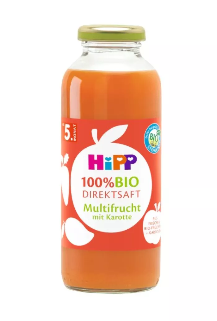 Gepresster Apfel- und Orangensaft, mit Karotten- und Mangopüree und Vitamin C. Für besondere Ernährungszwecke für Säuglinge und Kinder.