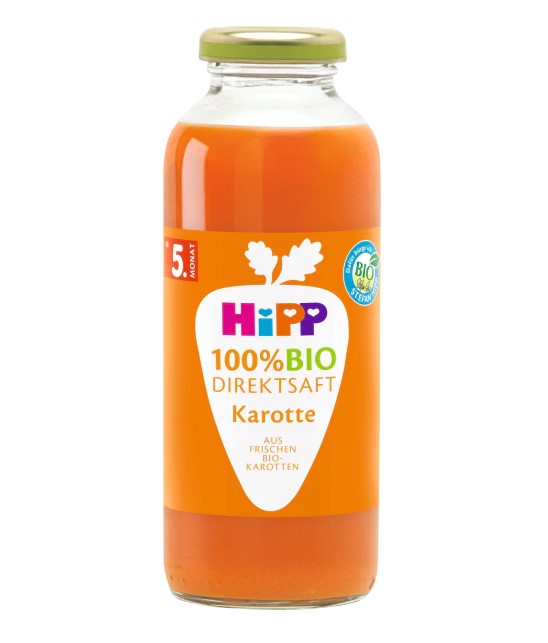Gepresster Karottensaft, mit Zitronensaft und Vitamin C. Für besondere Ernährungszwecke für Säuglinge und Kinder.