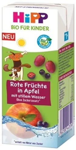 Zusammensetzung: stilles Quellwasser, Apfelsaft* aus Konzentrat 28 %, Saft* aus roten Weintrauben mit niedrigem Säuregehalt 5 %, schwarzer Johannisbeersaft* aus Konzentrat 2,4 %, Apfelbeersaft aus Konzentrat 0,6 %.