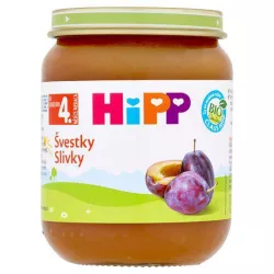 Fruchthaltige Nahrung (Pflaumen), geeignet für Kinder ab 4 Monaten (sofern unabhängige Personen mit medizinischer oder pharmazeutischer Qualifikation oder mit Qualifikationen im Bereich Ernährung nichts anderes empfehlen). Entwickelt für eine spezielle Ernährung.
