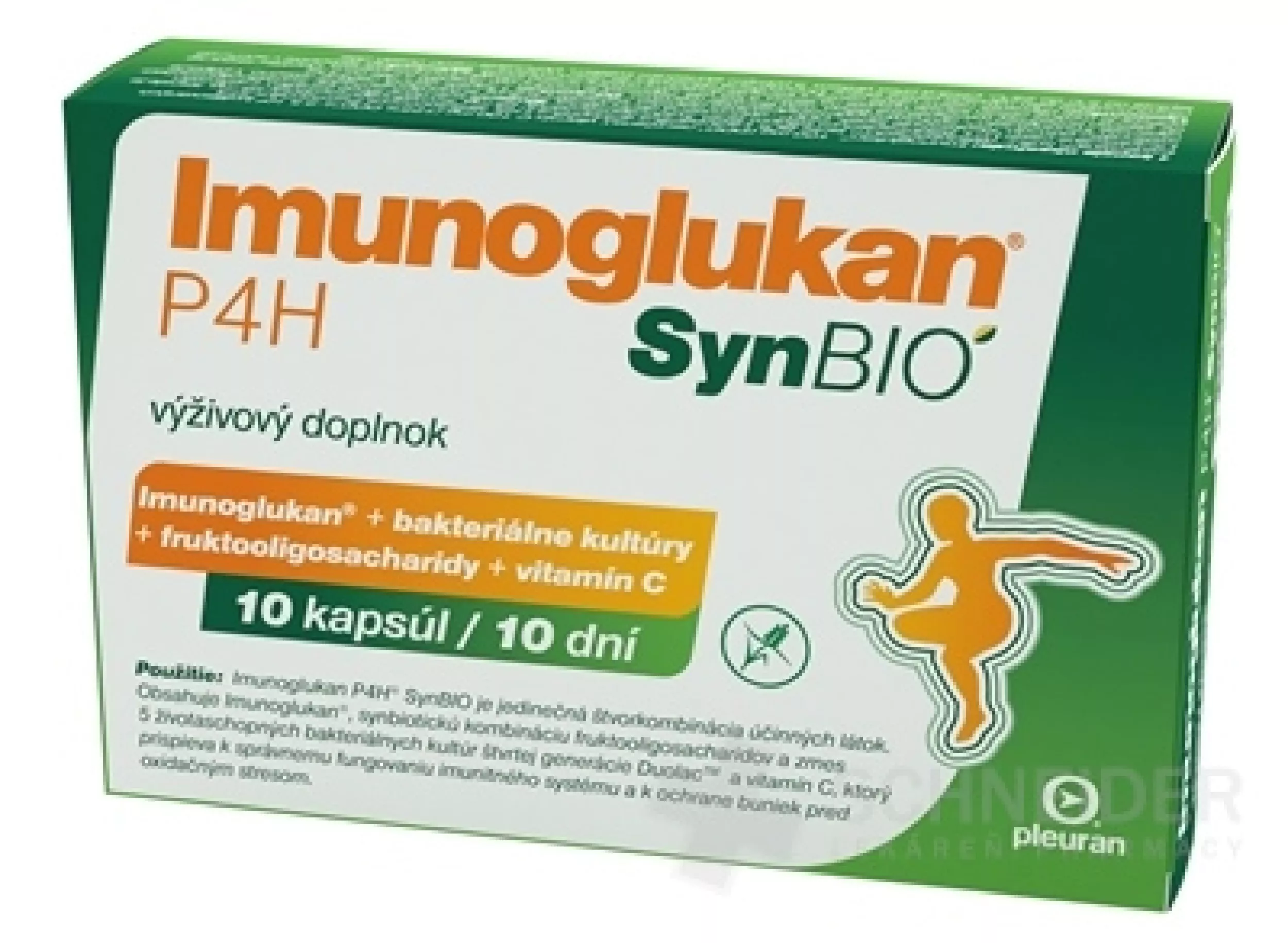Das Nahrungsergänzungsmittel ist eine Kombination aus vier Wirkstoffen. Es enthält Imunoglukan®, eine synbiotische Kombination aus Fructooligosacchariden und einer Mischung aus 5 lebensfähigen Bakterienkulturen der vierten Generation Duolacµ™ und Vitamin C, das zur ordnungsgemäßen Funktion des Immunsystems und zum Schutz der Zellen vor oxidativem Stress beiträgt.