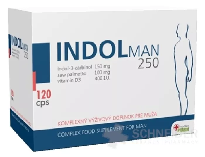 Nahrungsergänzungsmittel, eine Kapsel enthält Indol-3-Carbinol (I3C) – 150 mg, Sägepalme (Serenoa repens, Extrakt) – 100 mg und Vitamin D3 – 10 µg (400 IE) (200 % RVH – Referenznährwert).