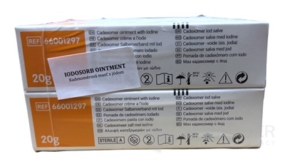 Sterile dunkelbraune Salbe bestehend aus Cadexomer (modifizierte Stärkemikrokügelchen), Polyethylenglykol, Polaxamer und Jod. Cadexomerperlen sind biologisch abbaubar. IODOSORB-Salbe entfernt überschüssiges Exsudat und devitalisiertes Gewebe aus dem Wundbett und reduziert die Menge an Bakterien auf der Wundoberfläche. Dabei verwandelt es sich in ein weiches, feuchtes Gel.