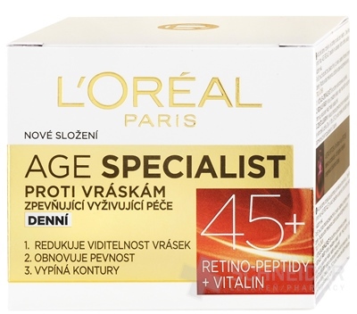 Kosmetisches Produkt. Tagescreme gegen Falten, bestimmt für die Altersgruppe 45+. Die Haut hat in jedem Alter unterschiedliche Bedürfnisse. Ab dem 45. Lebensjahr verlangsamt sich die Zellregeneration. Nach und nach treten sichtbare Falten auf. Die Haut verliert an Festigkeit und die Konturen werden weniger klar. Die Tagescreme hilft, die Zeichen der Hautalterung zu bekämpfen. Die Creme versorgt die Haut tagsüber intensiv mit Feuchtigkeit und das Ergebnis ist eine sichtbar straffere und seidig glatte Haut.