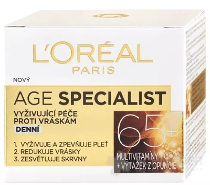 Kosmetisches Produkt. Tagescreme gegen Falten, bestimmt für die Altersgruppe 65+. Die Haut hat in jedem Alter unterschiedliche Bedürfnisse. Ab dem 65. Lebensjahr verliert die Haut wichtige Nährstoffe, was zu einer Schwächung der natürlichen Schutzbarriere führt. Die Haut wird weniger straff und es bilden sich Pigmentflecken. Die mit einem Multivitaminkomplex, bestehend aus den Vitaminen E und B3, angereicherte Zusammensetzung unterstützt die natürlichen Prozesse der Hauterneuerung und sorgt für eine Schutzbarriere. Tagsüber spendet es der Haut intensive Feuchtigkeit und das Ergebnis ist eine sichtbar straffere und seidig glatte Haut.