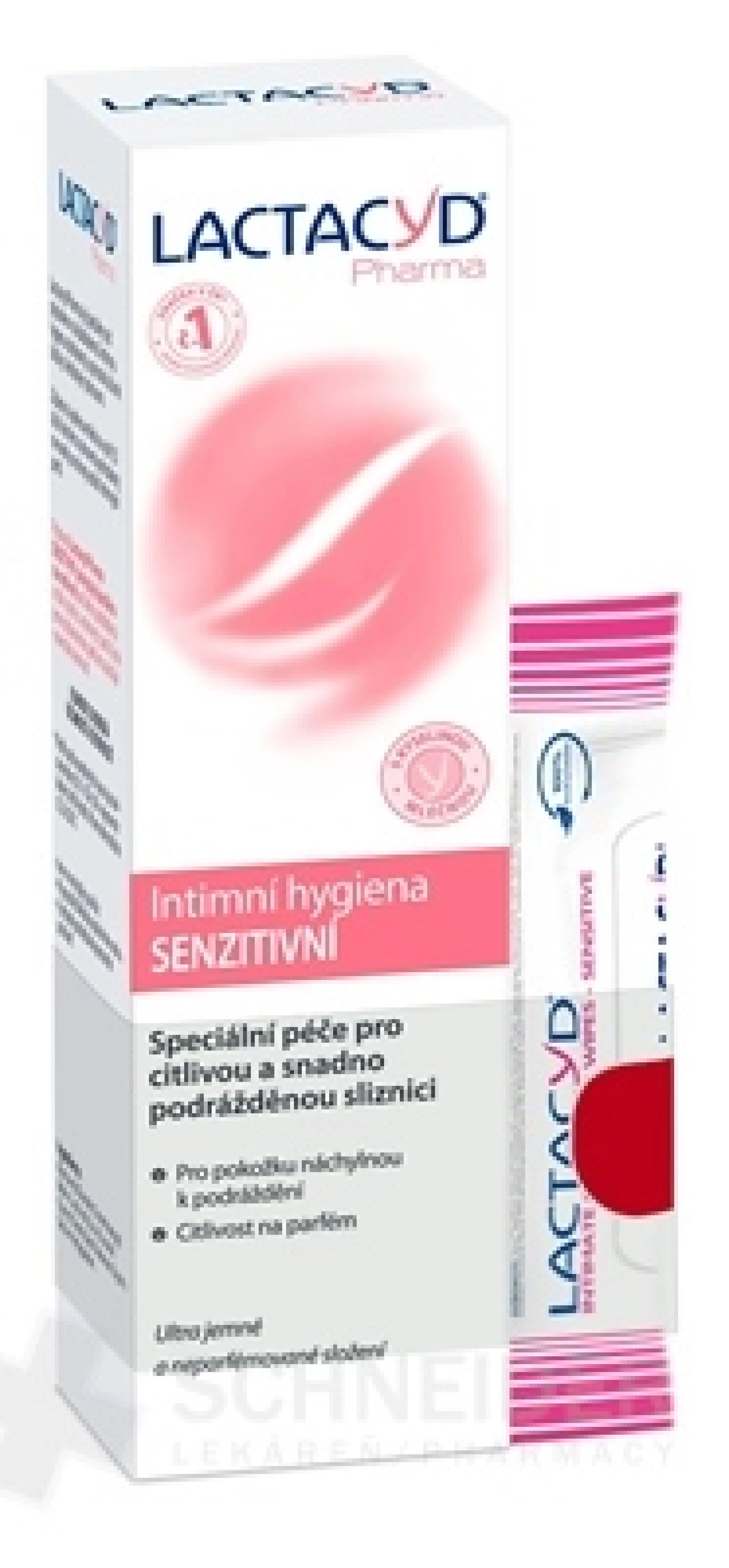 Die Packung enthält das Präparat Latacyd Pharma Intimhygiene SENSITIVE + kostenlose Lactacyd-Feuchttücher für die Intimhygiene.