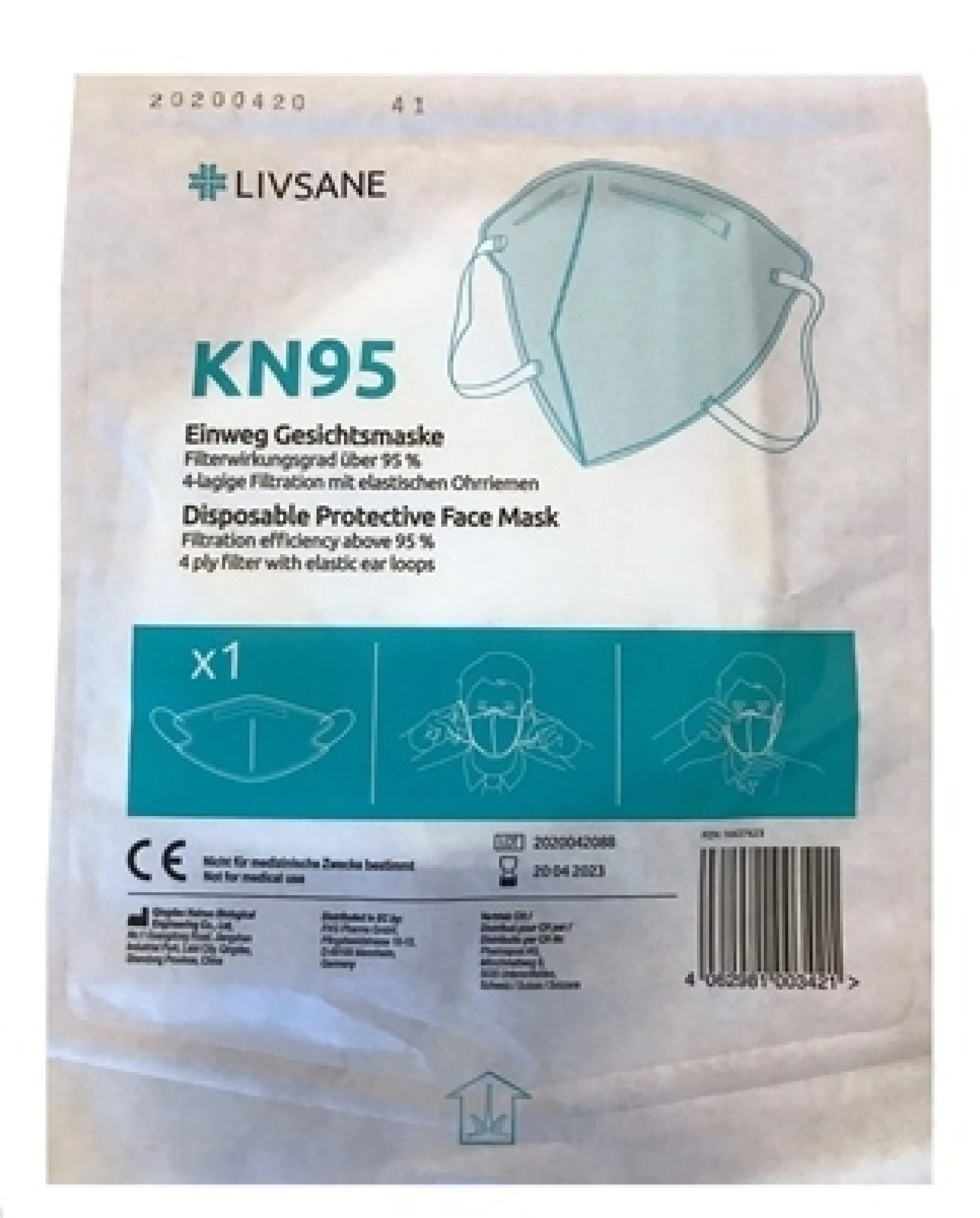 KN95-Atemschutzmaske aus Vliesstoff mit vierschichtiger Filterung. Mit elastischen Bändern für eine flexible Passform. Konzipiert für den einmaligen Gebrauch.