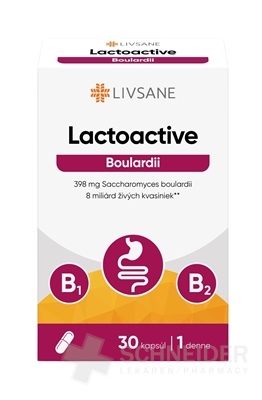 Zusammensetzung: Saccharomyces cerevisiae var. boulardii in Pulverform (8 x 10 9 KBE); Riboflavin (0,7 mg); Thiamin (0,55 mg); Hydroxypropylmethylcellulose (Kapselhülle).
