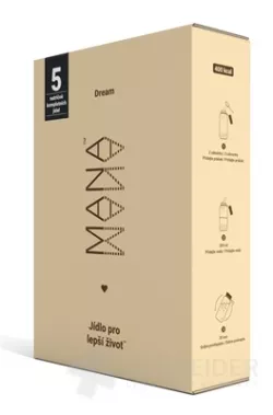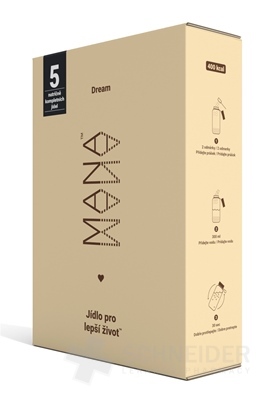 Pulver zur Zubereitung eines Getränks (vollwertiges Lebensmittel), das Proteine, Vitamine und Mineralstoffe, Zucker und Süßungsmittel enthält. Ein Beutel Mana-Pulver enthält 2001 kcal in 5 Portionen (86 g = 2 Messlöffel).