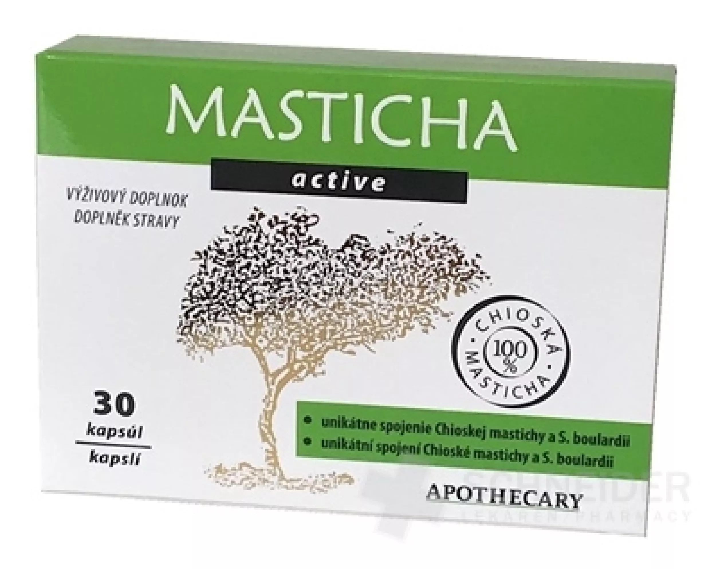 Nahrungsergänzungsmittel. Chios-Mastix mit aktiver Hefekultur von Saccharomyces boulardii und dem Stamm Lactobacillus reuteri DSM17648 in Kapseln.