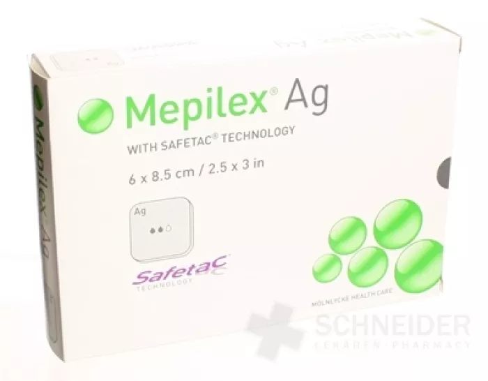 Mepilex Ag enthält Silbersulfat, das bei Kontakt mit Flüssigkeit Silberkationen freisetzt und so eine wirksame Barriere gegen Bakterien schafft und ein breites Spektrum wundbezogener Krankheitserreger (Bakterien und Pilze) inaktiviert, wie In-vitro-Experimente zeigten. Durch die Reduzierung der Anzahl der Mikroorganismen kann Mepilex Ag auch den Geruch reduzieren. Mepilex Ag ist ein weicher, bakteriostatischer Silikonschaumverband, der für die Behandlung von leicht bis mäßig exsudierenden Wunden wie Bein- und Fußgeschwüren, Druckgeschwüren und Verbrennungen zweiten Grades entwickelt wurde. Mepilex Ag kann bei infizierten Wunden als Teil einer Reihe von Maßnahmen eingesetzt werden, die von qualifiziertem medizinischem Fachpersonal ergriffen und überwacht werden. Mepilex Ag kann unter einem Druckverband verwendet werden. Anwendung: Mepilex Ag ist ein hochformiges Verbandmaterial, das Exsudat aufnimmt und den Wundbereich feucht hält. Da der Megilex Ag-Verband den Wundbereich feucht hält und die chirurgische Entfernung abgestorbenen Gewebes aus der Wunde fördert, kann sich die Wunde zunächst vergrößern. Es ist normal und wird erwartet.
