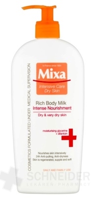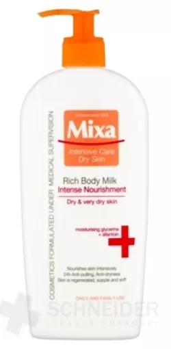 Kosmetisches Produkt. Konzentrierte Körperpflege mit Glycerin und Allantoin zur Ernährung und Flüssigkeitszufuhr. Die Körpermilch ist für trockene und empfindliche Haut gedacht. Es nährt intensiv und lindert auch sehr trockene Haut, die empfindlicher ist, zu Reizungen neigt und eine langfristige Spezialpflege benötigt. Getestet auf empfindlicher Haut. Auch für Kinderhaut geeignet. Es zieht schnell ein und fettet nicht.