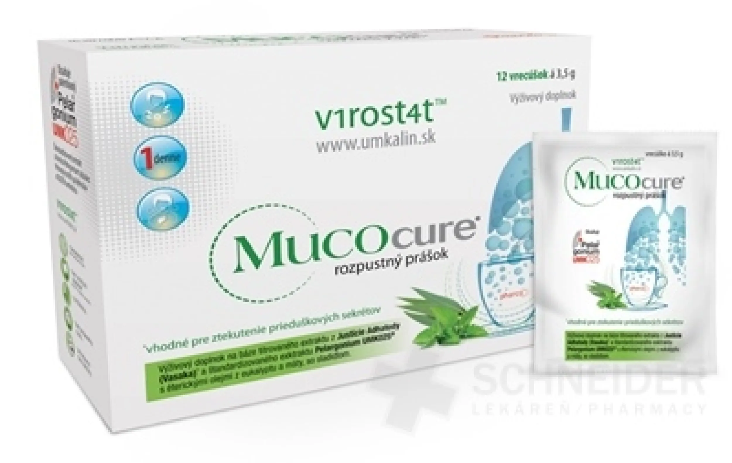 Nahrungsergänzungsmittel, lösliches Pulver. Enthält Pflanzenextrakte aus Justícia Adhatoda (Vasicin) und Pelargonia sidoides-Extrakt (Umcalin), mit ätherischen Ölen aus Eukalyptus, Minze und Süßungsmittel (Steviolglykoside aus Stevia).
