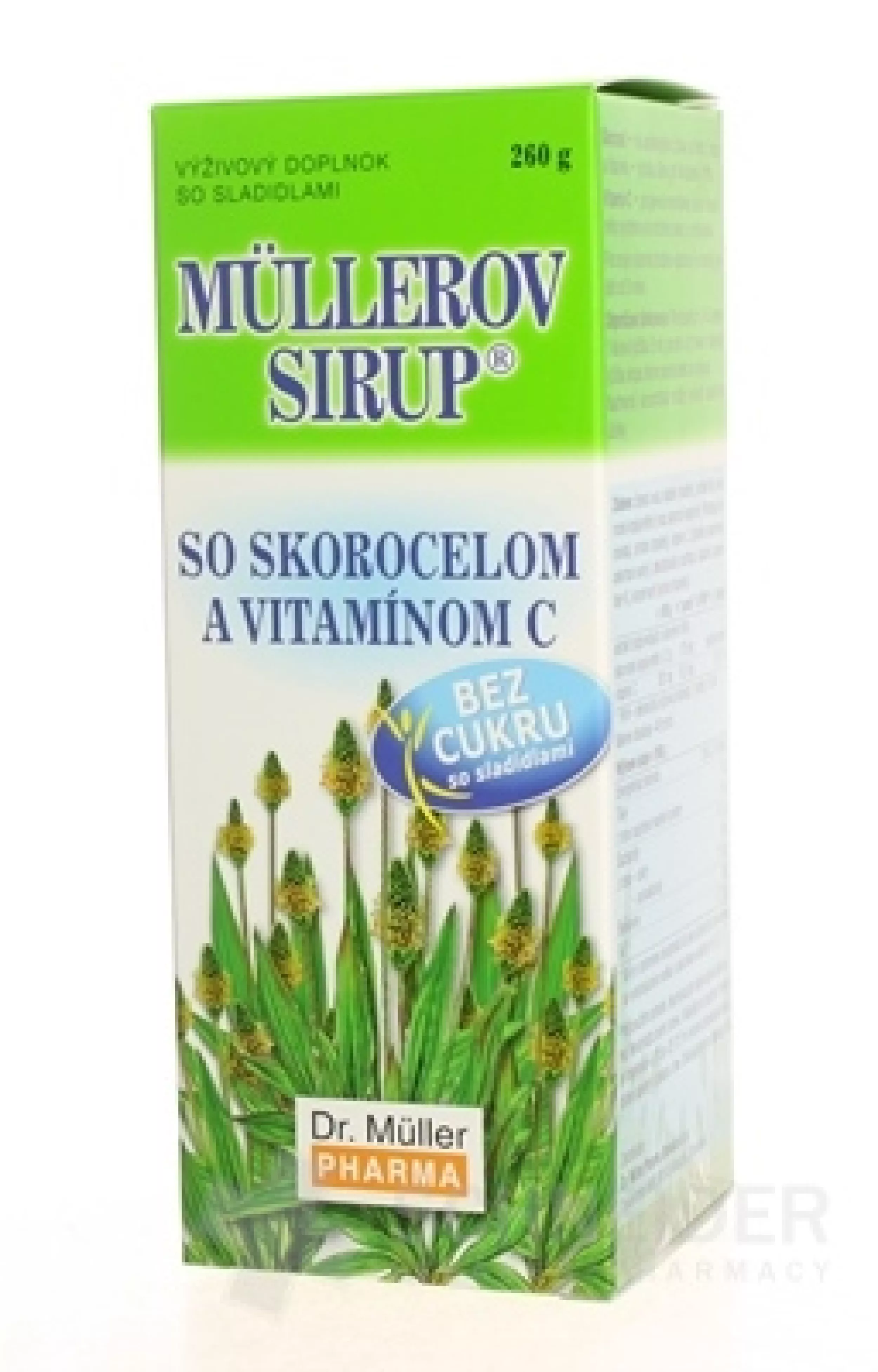 Nahrungsergänzungsmittelsirup mit Wegerichextrakt (10 % alkoholischer Wegerichblattextrakt – Plantago lanceolata), Vitamin C und Süßungsmittel (Maltit, Acesulfam K).
