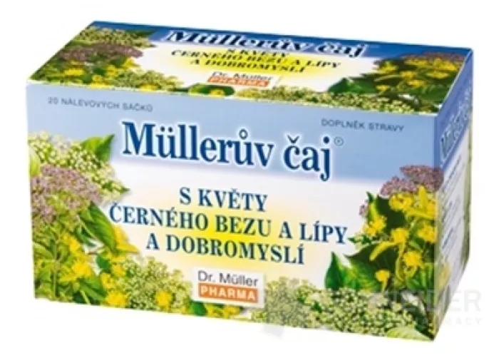 Kräutermischung im Aufgussbeutel. Enthält schwarze Holunderblüten (Sambucus nigra), Lindenblüten (Tilia cordata) und Majoran (Origanum vulgare).
