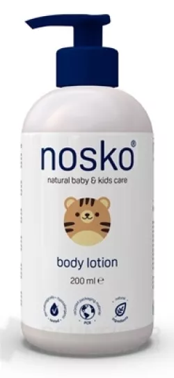Kosmetisches Produkt - Körperlotion. Natürliche und ökologische feuchtigkeitsspendende Körpermilch, angereichert mit Mandel-, Avocado- und Apfelöl, Apfelextrakt und Bisabolol, zur täglichen Pflege der Haut eines Kindes.