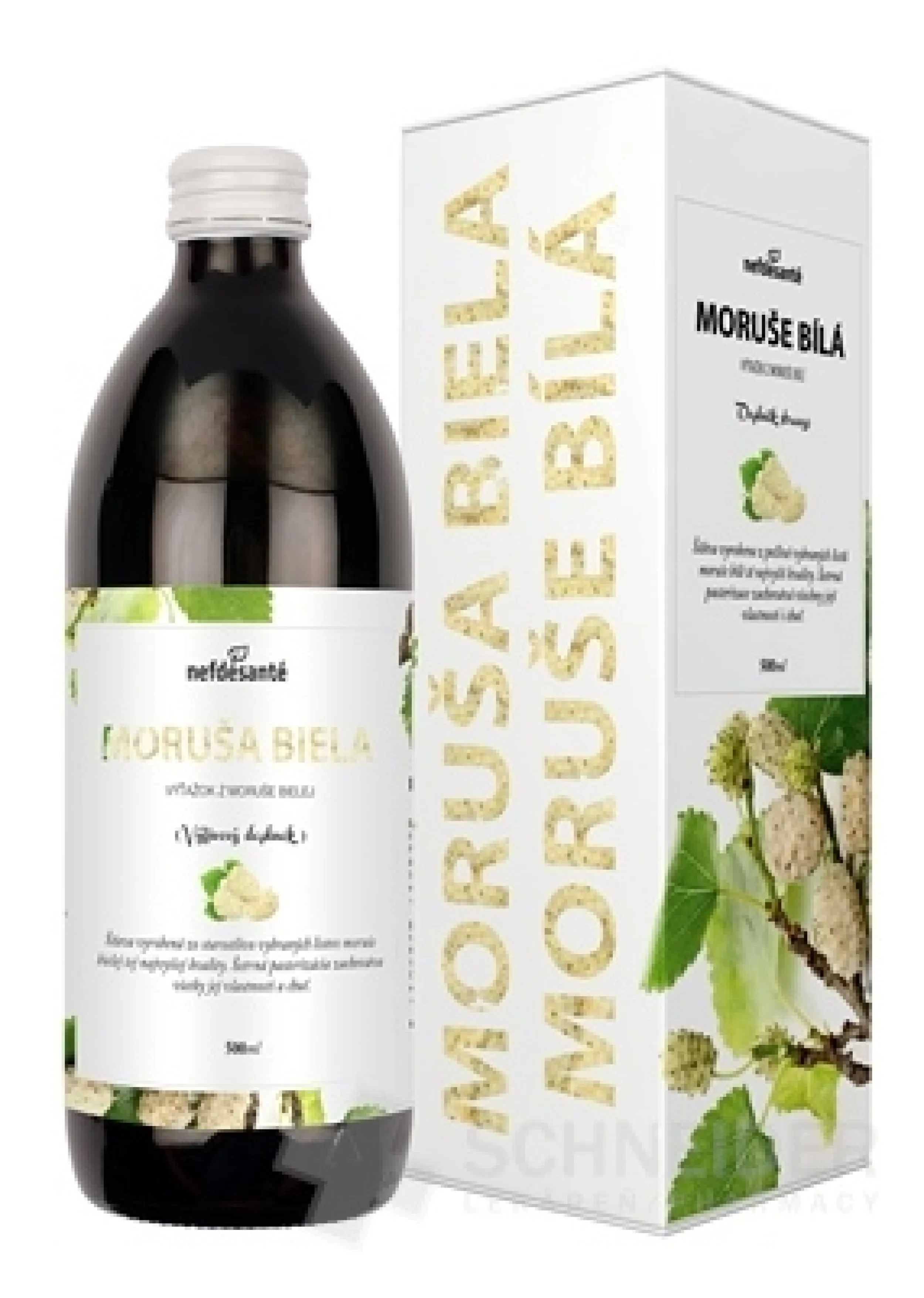 Nahrungsergänzungsmittel, Extrakt aus weißen Maulbeerblättern mit Zusatz von Vitamin C. Pasteurisierter Saft aus sorgfältig ausgewählten weißen Maulbeerblättern (Morus Alba L.) mit Zusatz von Vitamin C. 500-ml-Flasche im Karton verpackt.