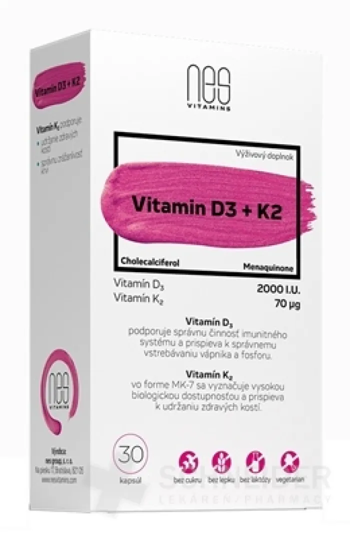 Nahrungsergänzungsmittel nesVITAMINS Vitamin D3 2000 IU + K2 70 µg ist: zuckerfrei, glutenfrei, laktosefrei, vegetarisch.