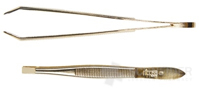 Professionelle Pinzette mit flacher Oberfläche. Vergoldet und bleibt lange glänzend.