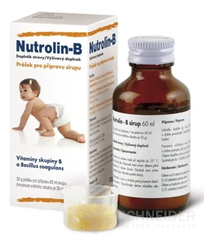 Nahrungsergänzungsmittel mit Erdbeergeschmack, enthaltend B-Vitamine und Milchsäurebakterien.
