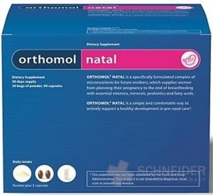 Nahrungsergänzungsmittel Natal - Schwangerschaft und Stillzeit, das wichtige Nährstoffe für die Entwicklung des Kindes während der Schwangerschaft und Stillzeit sowie für Frauen, die eine Schwangerschaft planen, liefert. Es enthält Folsäure, Omega-3-Fettsäuren DHA, lebende Bakterienkulturen, Vitamine, Mineralien und Spurenelemente.