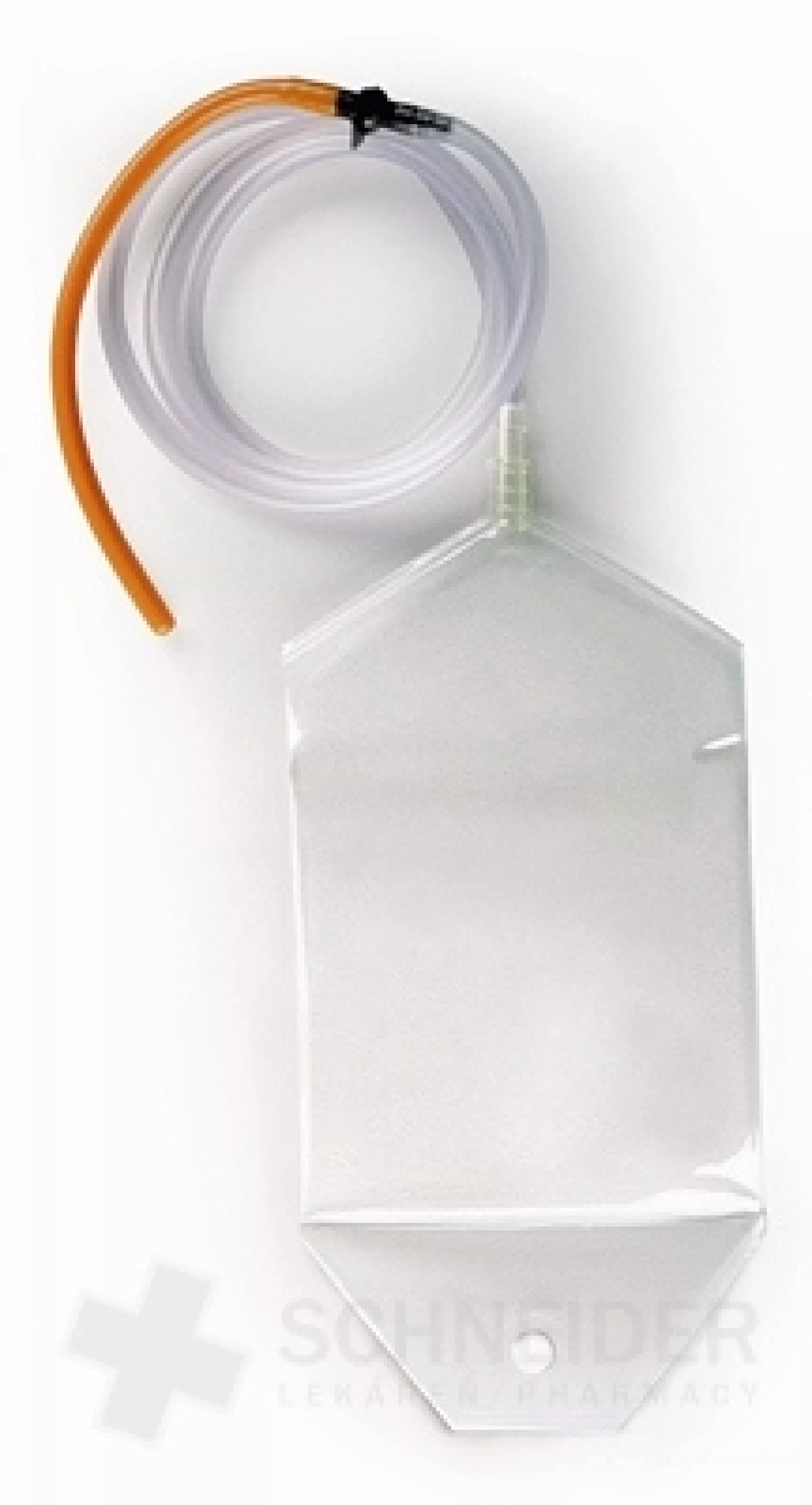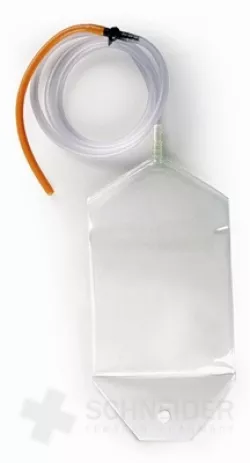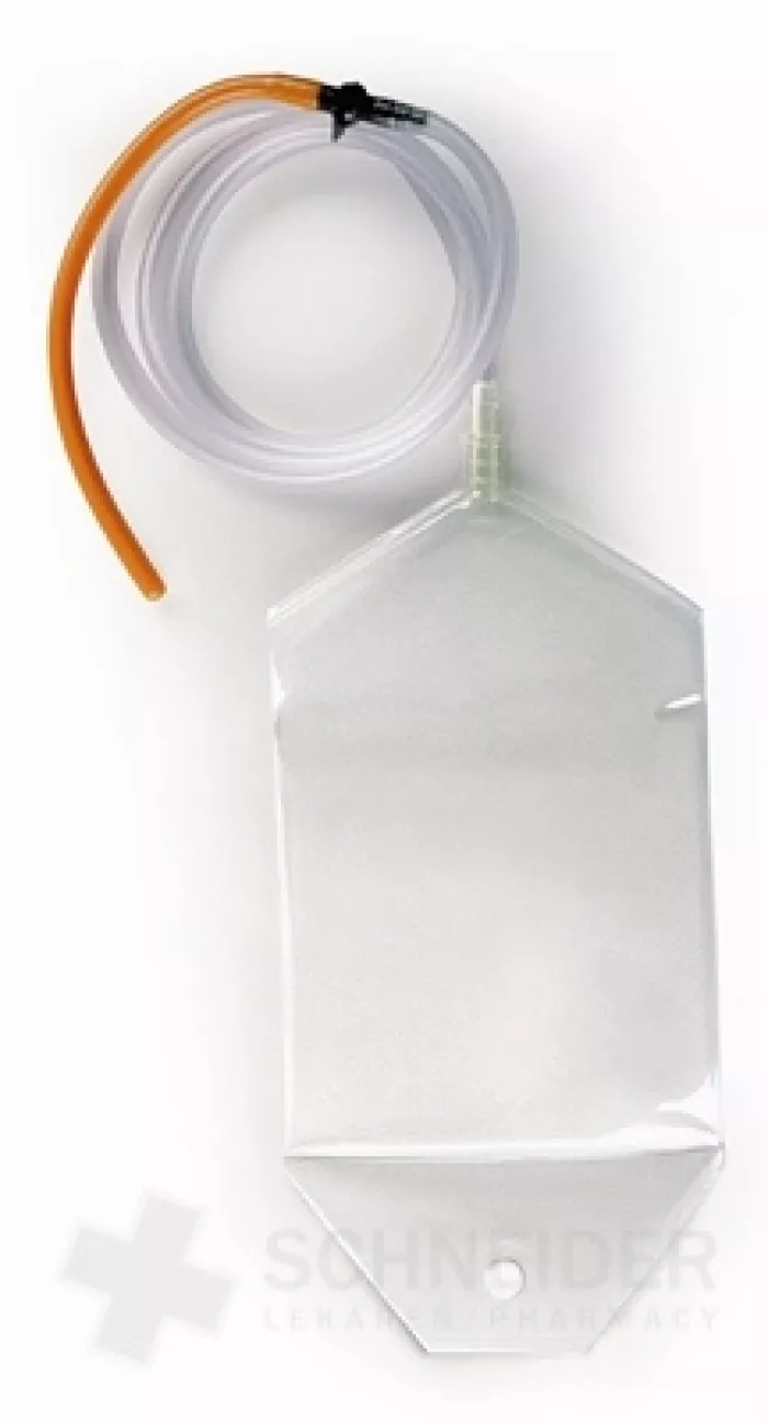 Kunststoff-Irrigator (Einlaufbehälter), ausgestattet mit einem Kunststoffventil, um den Flüssigkeitsfluss zu stoppen.