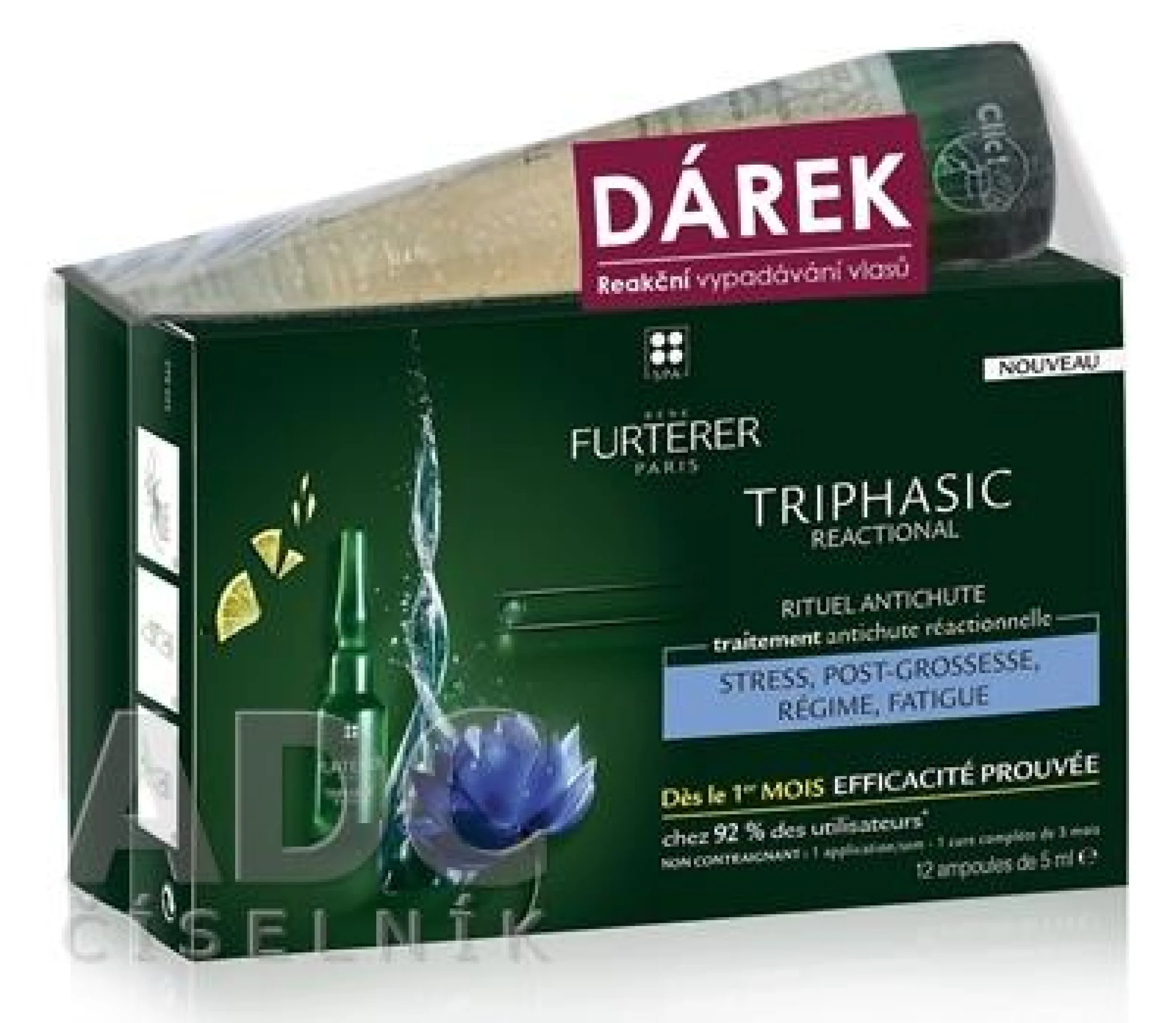 1. René Furterer Triphasic Reactional (12x5ml) – Kopfhaut- und Haarpflege bei reaktivem Haarausfall, der durch Stress, Geburt, Ernährung und Müdigkeit verursacht wird. Der einzigartige Wirkstoffkomplex mit hoher Effizienz trägt dazu bei, die Dichte des Haares sichtbar zu erhöhen und ihm die nötige Kraft und Vitalität zu verleihen. Ergebnisse bereits ab dem ersten Monat: Das Haar ist kräftiger und dicker.