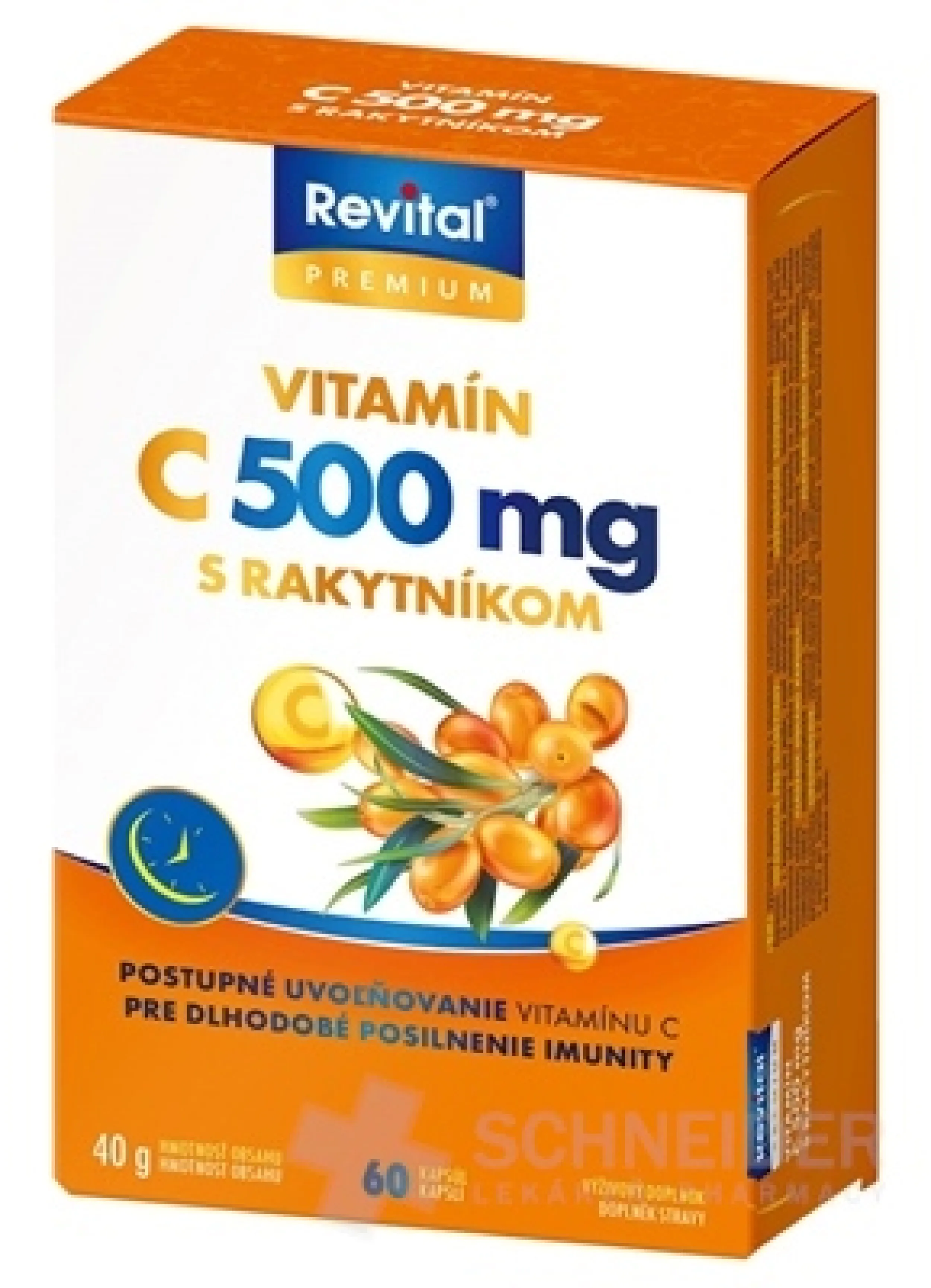 Nahrungsergänzungsmittel – Kapseln mit langsamer Freisetzung, enthaltend 500 mg Vitamin C und Sanddorn.