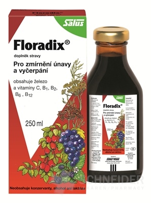 Nahrungsergänzungsmittel mit Eisen und Substanzen, die seine Aufnahme fördern. Es handelt sich um die Vitamine B1, B2, B6, B12 und C sowie Extrakte aus Kräutern und Fruchtsäften, Extrakte aus Weizenkeimen, Hefe und Hagebutte.