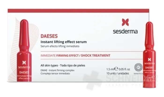 Serum in Ampullen, sofortiger Lifting-Effekt. Für alle Hauttypen geeignet. Es enthält DMAE (Dimethylaminoethanol oder Deanol), einen natürlichen Nährstoff, der in freier und liposomaler Form vorliegt, liposomales organisches Silizium und Hyaluronsäure.