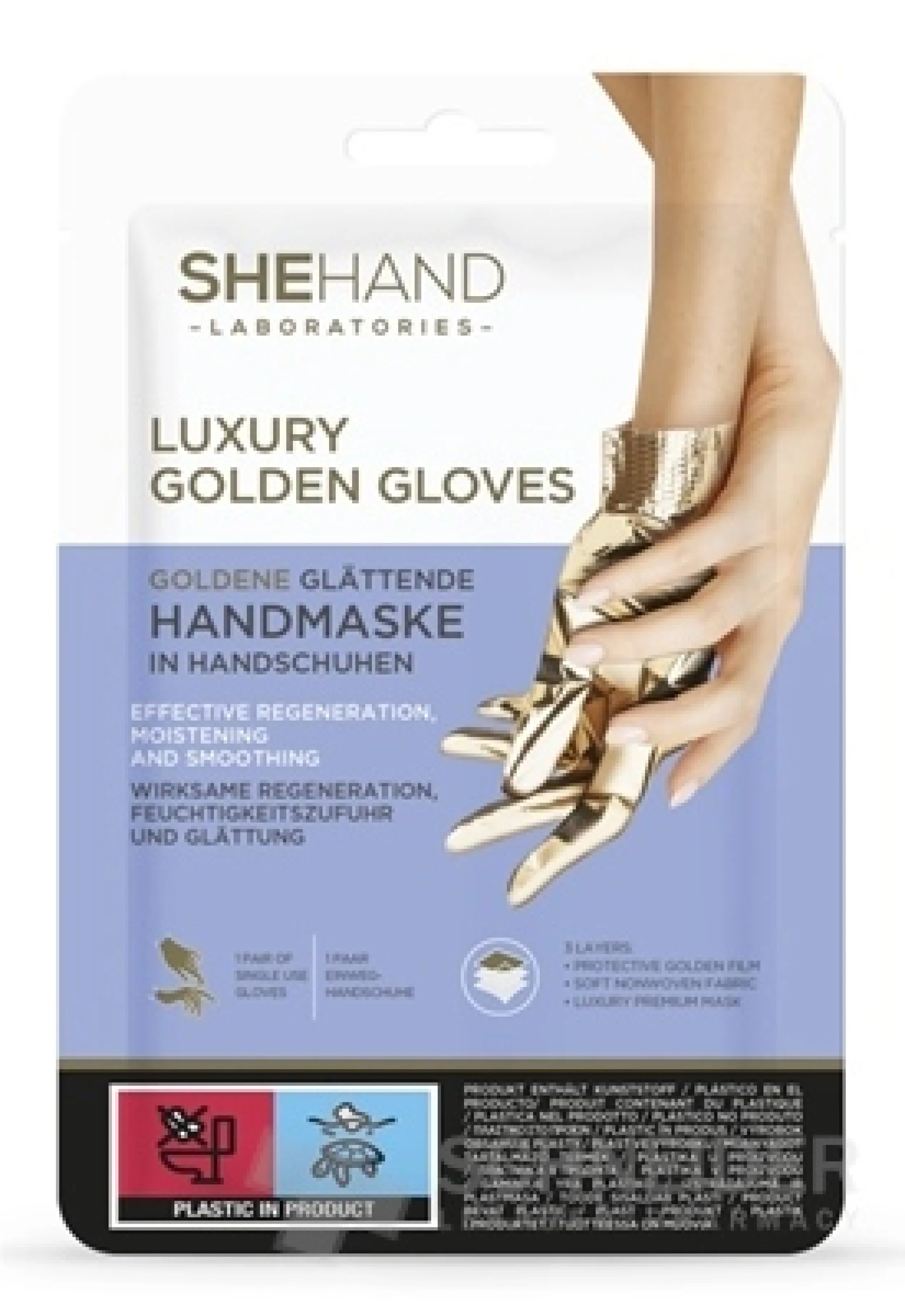 Handmaske in Form von goldenen Handschuhen.