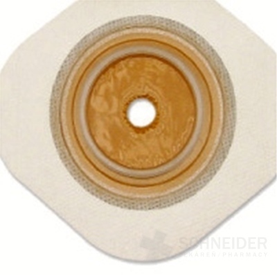 Im Mittelteil befindet sich Stomahesive®-Material, der Rand wird durch einen flexiblen Mikroporenrand gebildet. Es kopiert die Körperoberfläche (Hautfalten, Narben) gut. Er lässt sich die Haare schneiden.