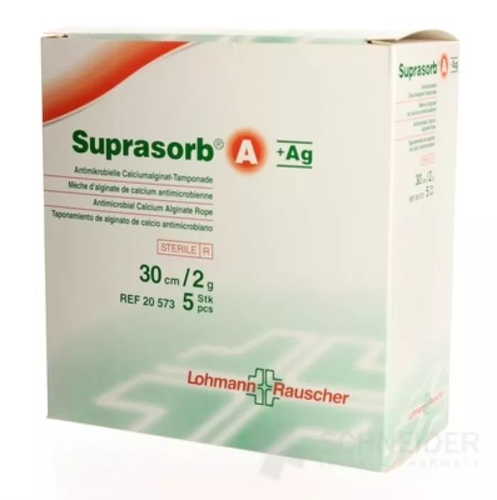 Antimikrobielle Calciumalginat-Kompressen/Tamponaden Suprasorb® A + Ag sind weiche, eng anliegende Wundauflagen. Mit Silber imprägnierte Calciumalginatfasern reagieren mit Wundexsudat oder Blut und bilden ein Gel.