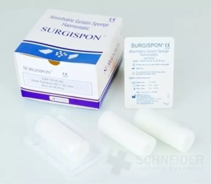 Absorbierbarer blutstillender Gelatineschwamm. Ein steriler, formbarer, wasserunlöslicher, resorbierbarer Schwamm ist für die blutstillende Anwendung zum Auftragen auf eine blutende Oberfläche vorgesehen.