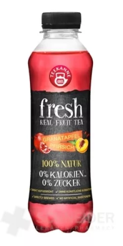 Ein kalorienarmes, alkoholfreies Getränk aus einem Aufguss von Früchten und Kräutertee, aromatisiert mit Granatapfel und Pfirsich, mit Süßstoff. Ungesättigt.
