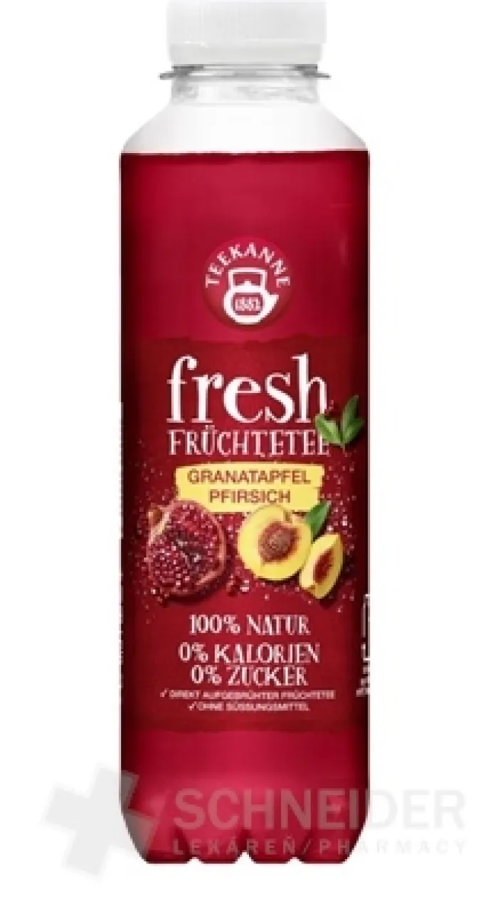 Ein kalorienarmes, alkoholfreies Getränk aus einem Aufguss von Früchten und Kräutertee, aromatisiert mit Granatapfel und Pfirsich, mit Süßstoff. Ungesättigt.