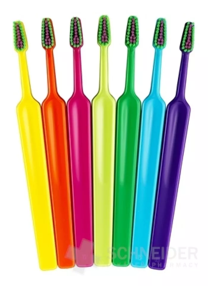 TePe Compact x-soft Zahnbürsten im neuen Design mit verschiedenfarbigen Fasern. Verpackt im Beutel, 3 + 1 gratis.