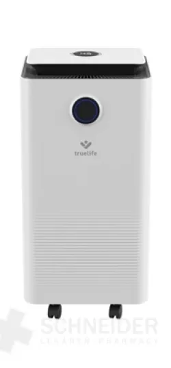 Geräuschpegel 37 dB. Gewicht 11 kg, Räder, weiße Farbe, klares Design.