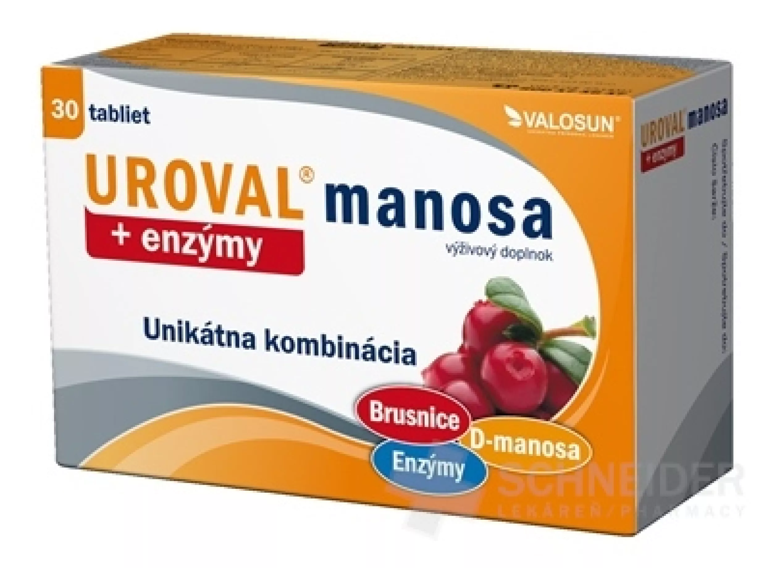 Das Nahrungsergänzungsmittel Uroval ® Mannose + Enzyme enthält D-Mannose, Cranberry-Extrakt (1 Tablette enthält 7,2 mg PAC-Proanthocyanide), Bromelain, Trypsin.