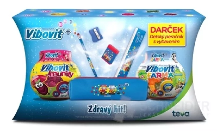 Weihnachtsverpackung der Nahrungsergänzungsmittel VIBOVIT+ IMMUNITY und FARMA Gummies mit beiliegendem Geschenk – einem Kindermäppchen mit Ausstattung.