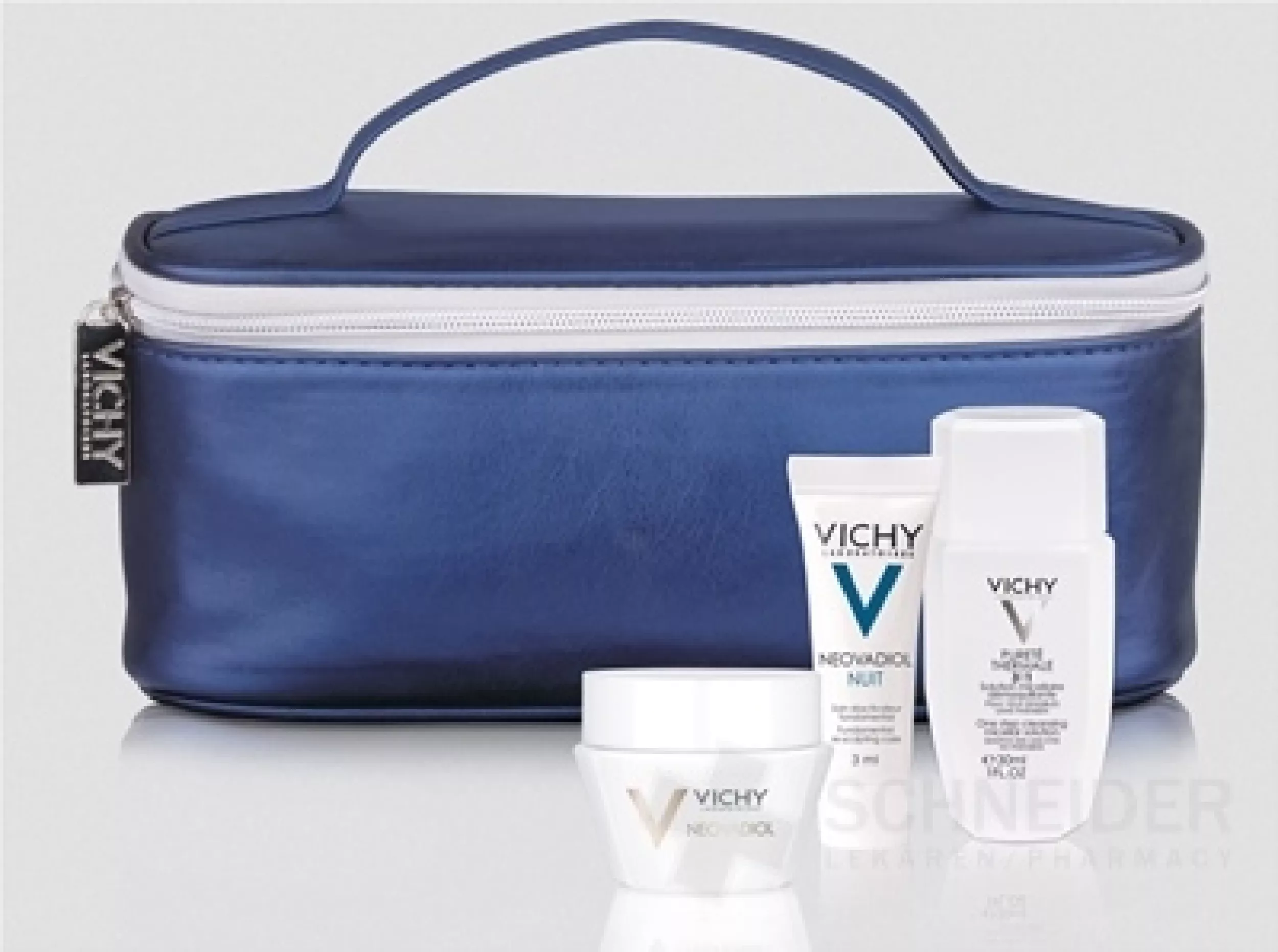 Vichy NEOVADIOL – Inhalt des Beutels: • Tägliche Pflege 15 ml • Mizellenwasser 30 ml • Nachtpflege 3 ml • Teint Idéal Make-up-Probe 1,5 ml • Probe des Ideal Body Körperbalsams 7 ml • Broschüre mit einer Übersicht über Vichy-Produkte
