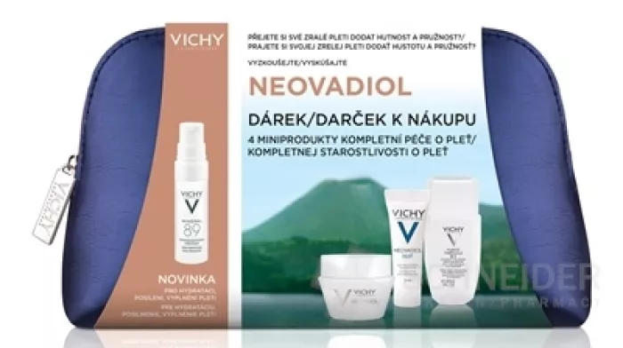 Vichy NEOVADIOL – Inhalt des Beutels: • Tägliche Pflege 15 ml • Mizellenwasser 30 ml • Nachtpflege 3 ml • Mineral 89 Hyaluro-Booster 5 ml • Broschüre mit einer Übersicht über Vichy-Produkte
