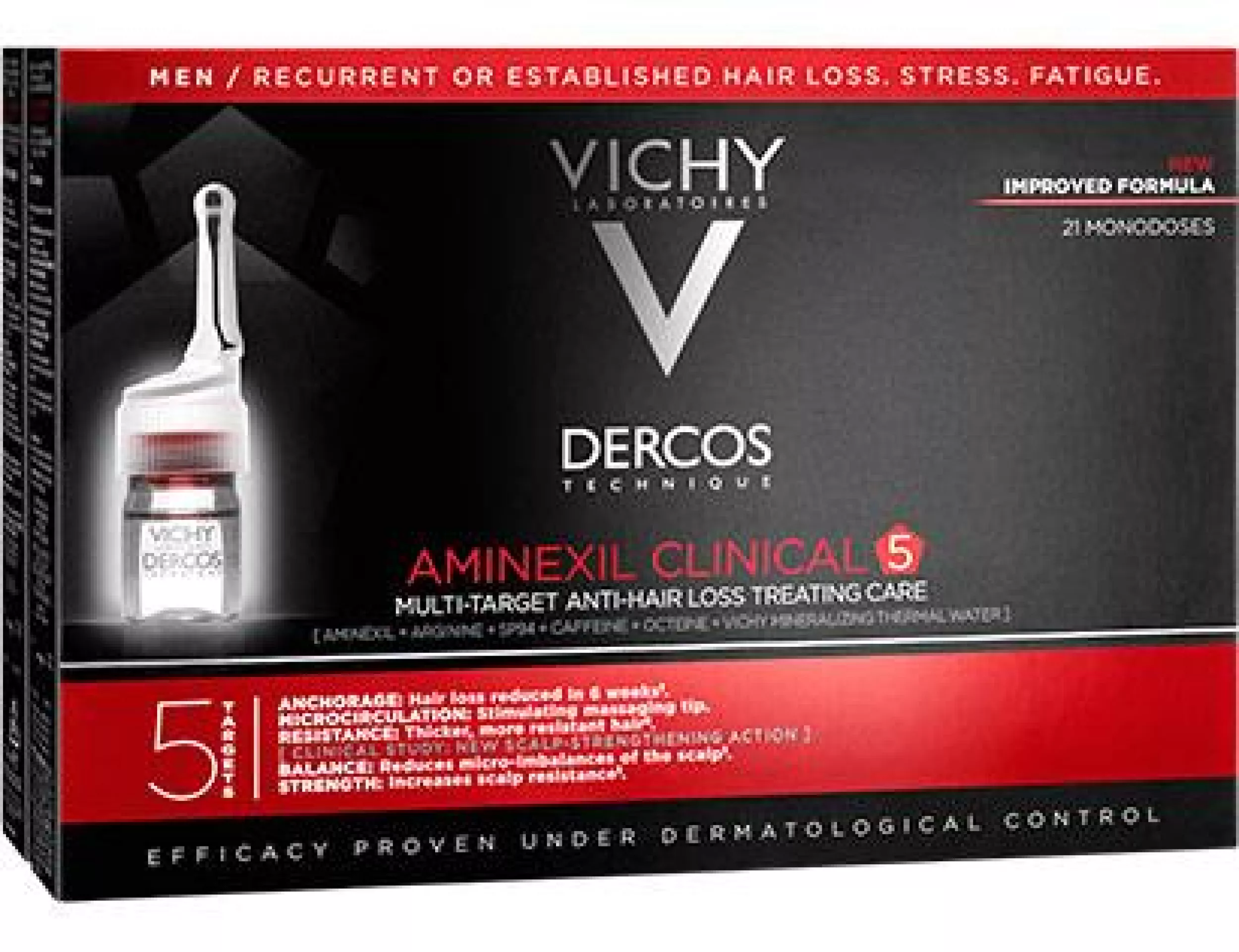 Mehrzweckbehandlung gegen Haarausfall für Männer. Die Kombination der Wirkstoffe Aminexil, SP94, Arginin, Octein und Vichy Mineralizing Thermal Water hilft bei der Bekämpfung von Haarausfall, verankert das Haar in der Kopfhaut, mildert das Mikroungleichgewicht der Kopfhaut und erhöht ihre Widerstandskraft. Die Packung enthält 21 Ampullen mit einem sehr präzisen Applikator. Die Textur ist nicht fettend, nicht klebrig und schnell trocknend.