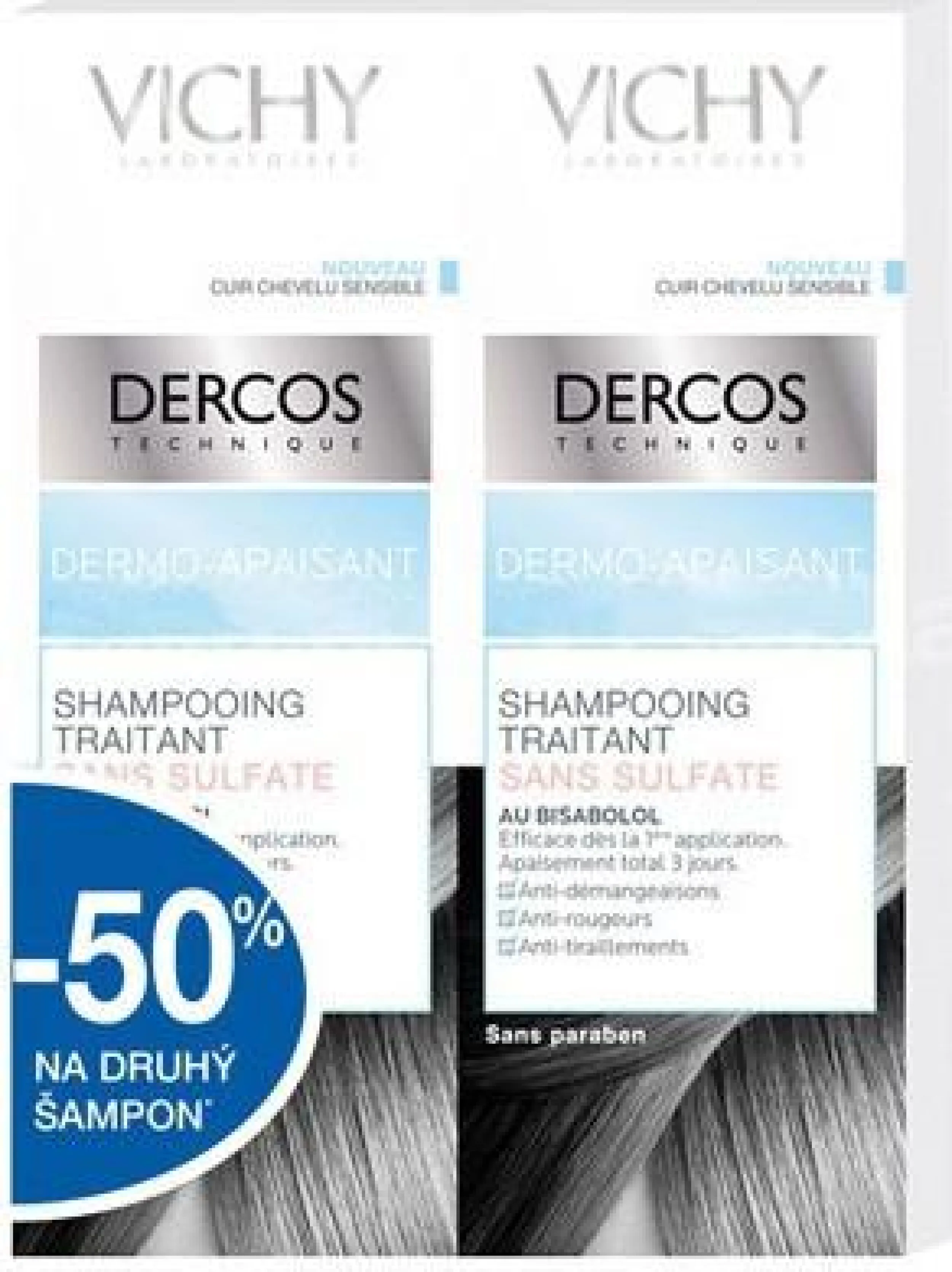 Vichy Dercos Dermo Sensitive Duo 1 + 50 % der zweiten Packung gratis. Beruhigendes Shampoo für empfindliche Kopfhaut. Wirksam gegen Brennen und Juckreiz ab der ersten Anwendung. Ohne Parabene und Silikone. Für glänzendes und weiches Haar.