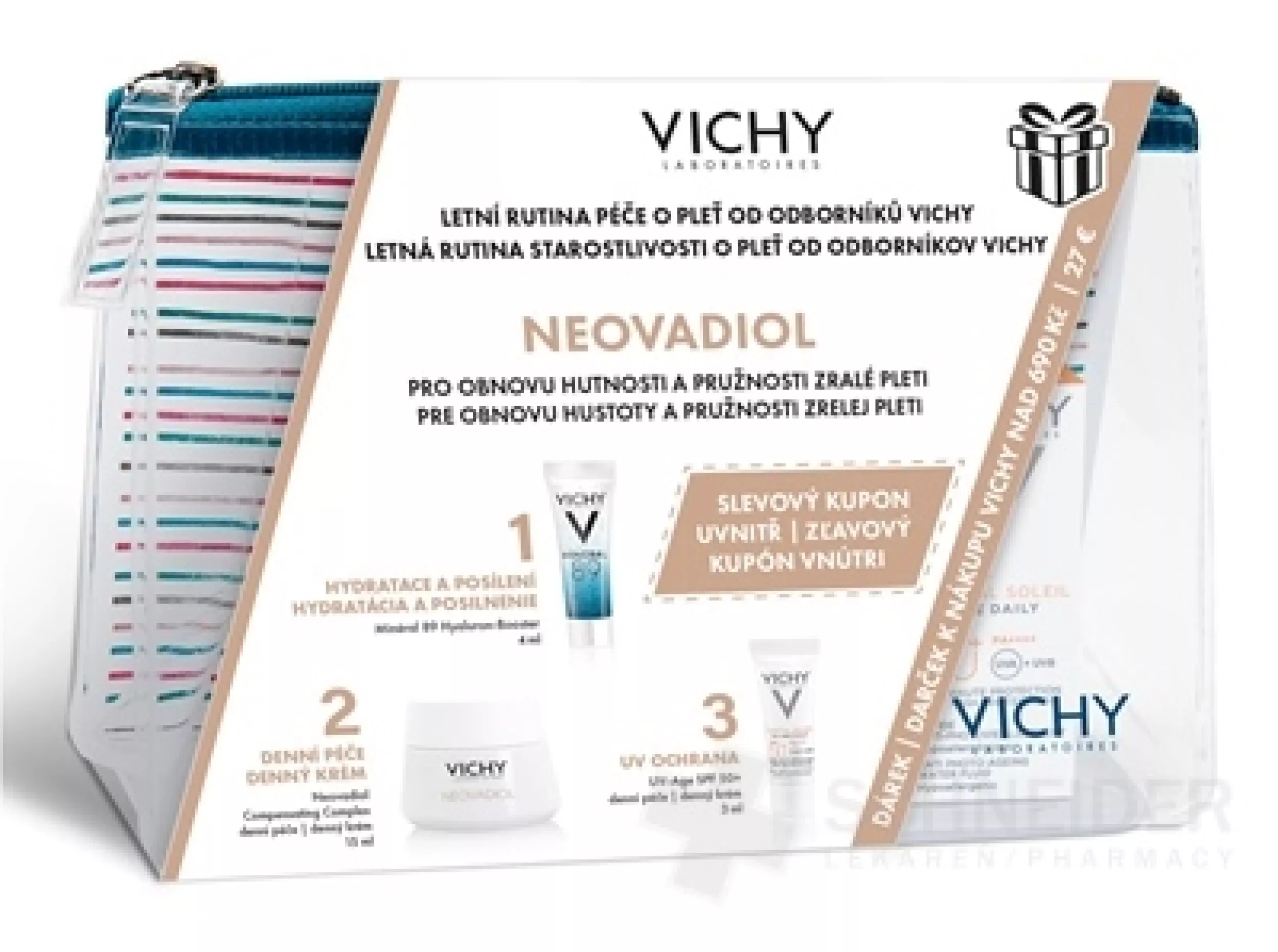 Eine Hautpflegeroutine zur Stärkung und Straffung der Konturen alternder Haut im transparenten Beutel als Geschenk beim Kauf von Vichy-Produkten. Die Tasche enthält: