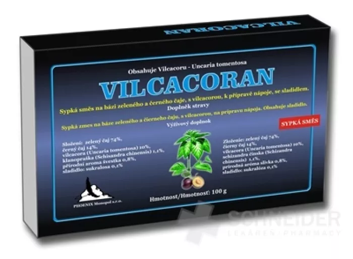 Zutaten: grüner Tee 74 %, schwarzer Tee 14 %, Vilcacora (Uncaria tomentosa) 10 %, chinesische Schizandra (Schizandra chinensis) 1,1 %, natürliches Pflaumenaroma 0,8 %, Süßstoff: Sucralose 0,1 %.