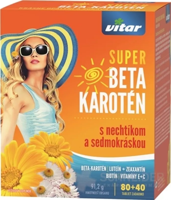 Nahrungsergänzungsmittel – Tabletten mit Pflanzenextrakt und Vitamingehalt. Neben Beta-Carotin enthält es eine Kombination aus natürlichem Ringelblumenextrakt (eine Quelle natürlicher Carotinoide – Lutein und Zeaxanthin), den Vitaminen E und C, Selen und dem Wirkstoff Biotin.