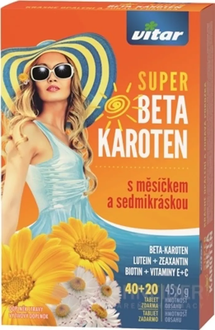 Nahrungsergänzungsmittel – Tabletten mit Pflanzenextrakt und Vitamingehalt. Neben Beta-Carotin enthält es eine Kombination aus natürlichem Ringelblumenextrakt (eine Quelle natürlicher Carotinoide – Lutein und Zeaxanthin), den Vitaminen E und C, Selen und dem Wirkstoff Biotin.