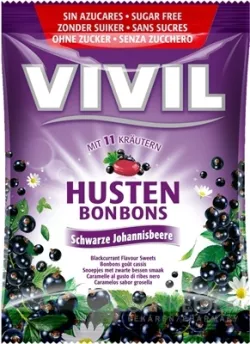 VIVIL HUSTEN-Erfrischungsbonbons mit Johannisbeergeschmack mit Extrakt aus 11 Kräutern ohne Zucker mit Ersatzsüßstoffen. Mehr unter adcc.sk