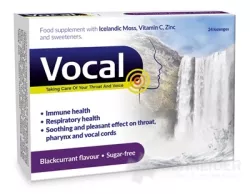 Nahrungsergänzungsmittel mit Süßungsmitteln, isländischer Flechte, Vitamin C und Zink. In Form von Pastillen, die sich im Mund auflösen, mit dem Geschmack schwarzer Johannisbeeren.